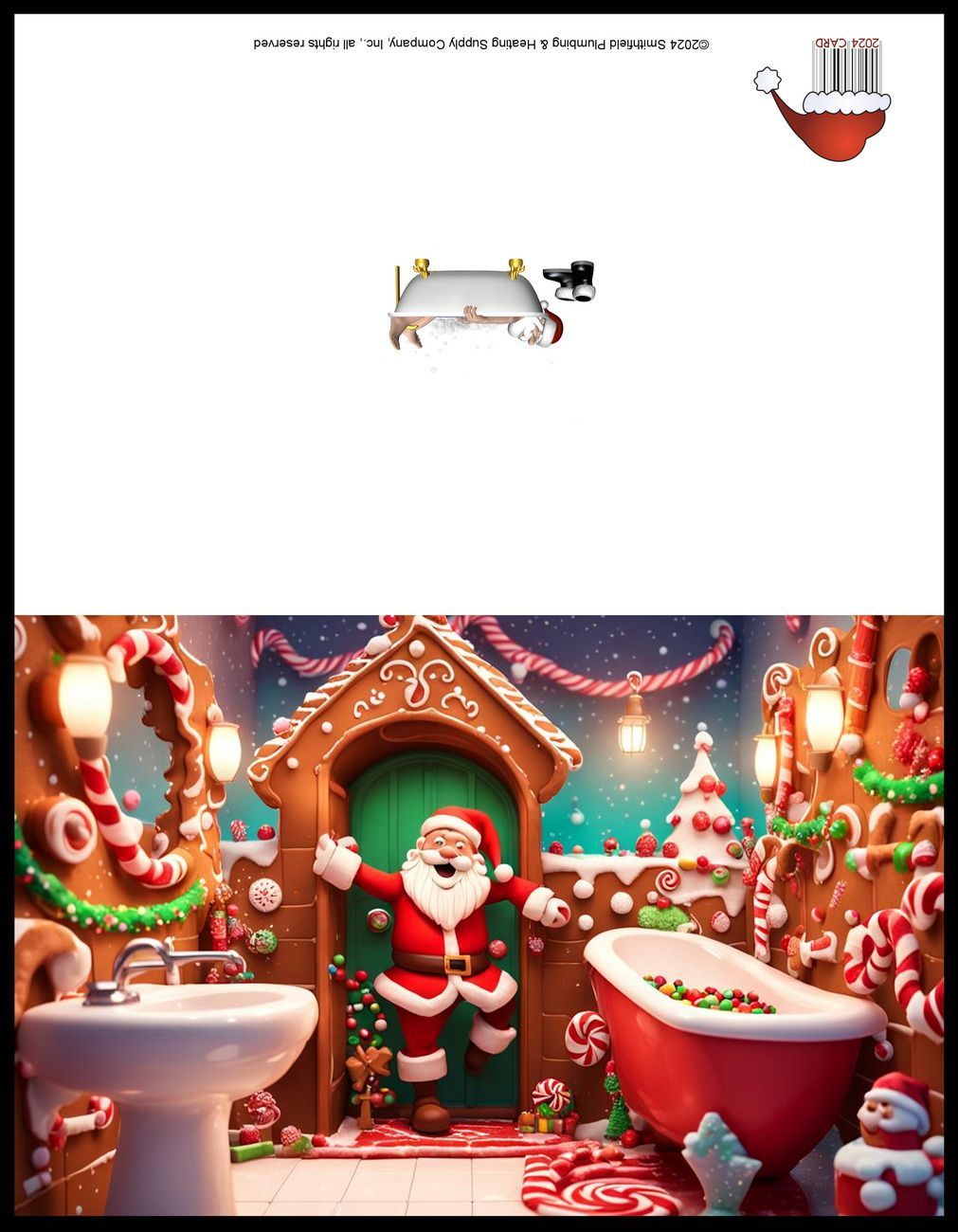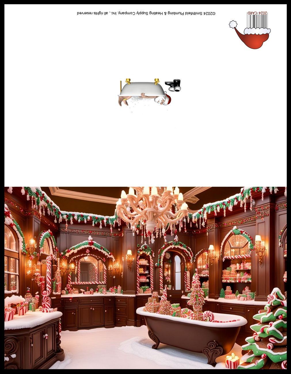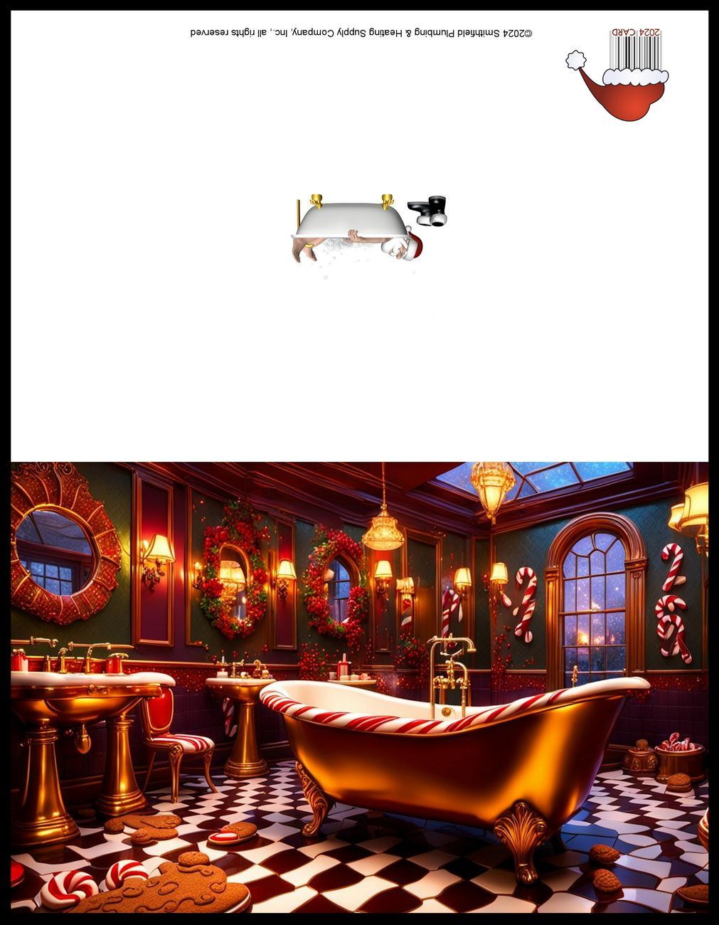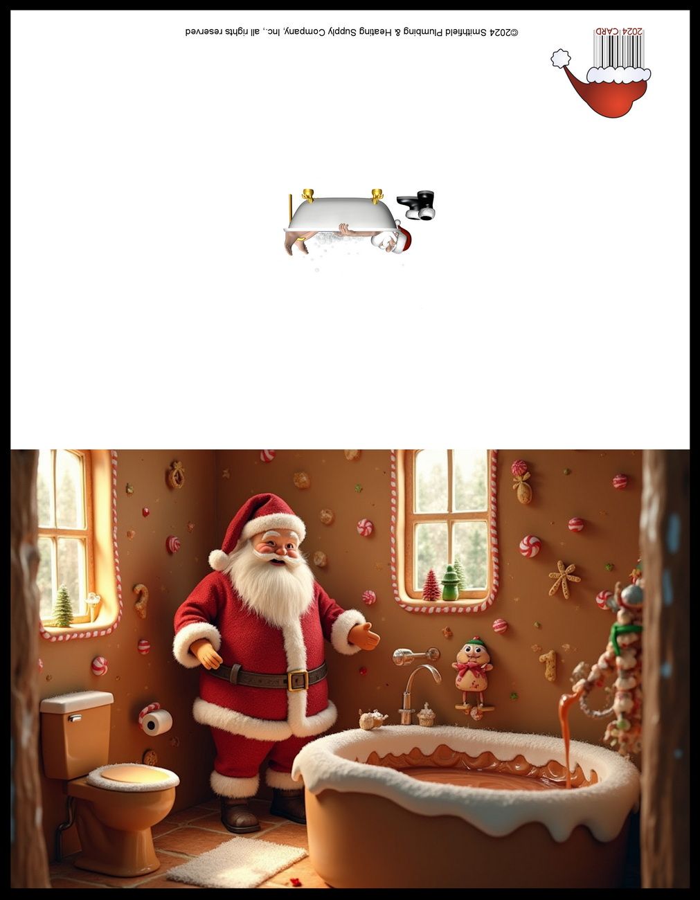 Santa filling a bathtub with carmel in a chocolate-style bathroom