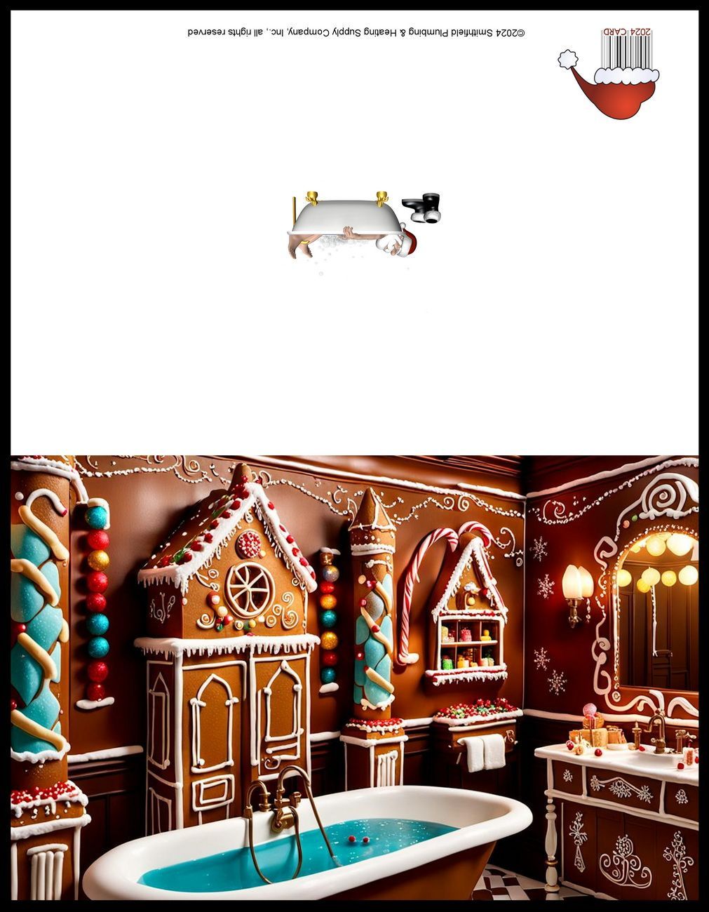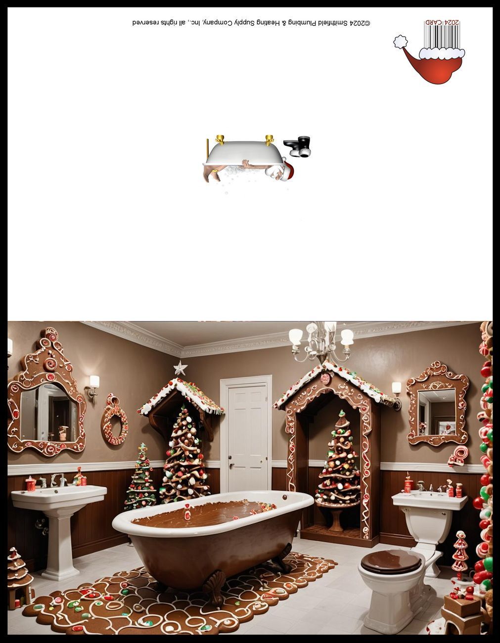Santa Claus in a bathroom with choclate and gingerbread fixtures.
